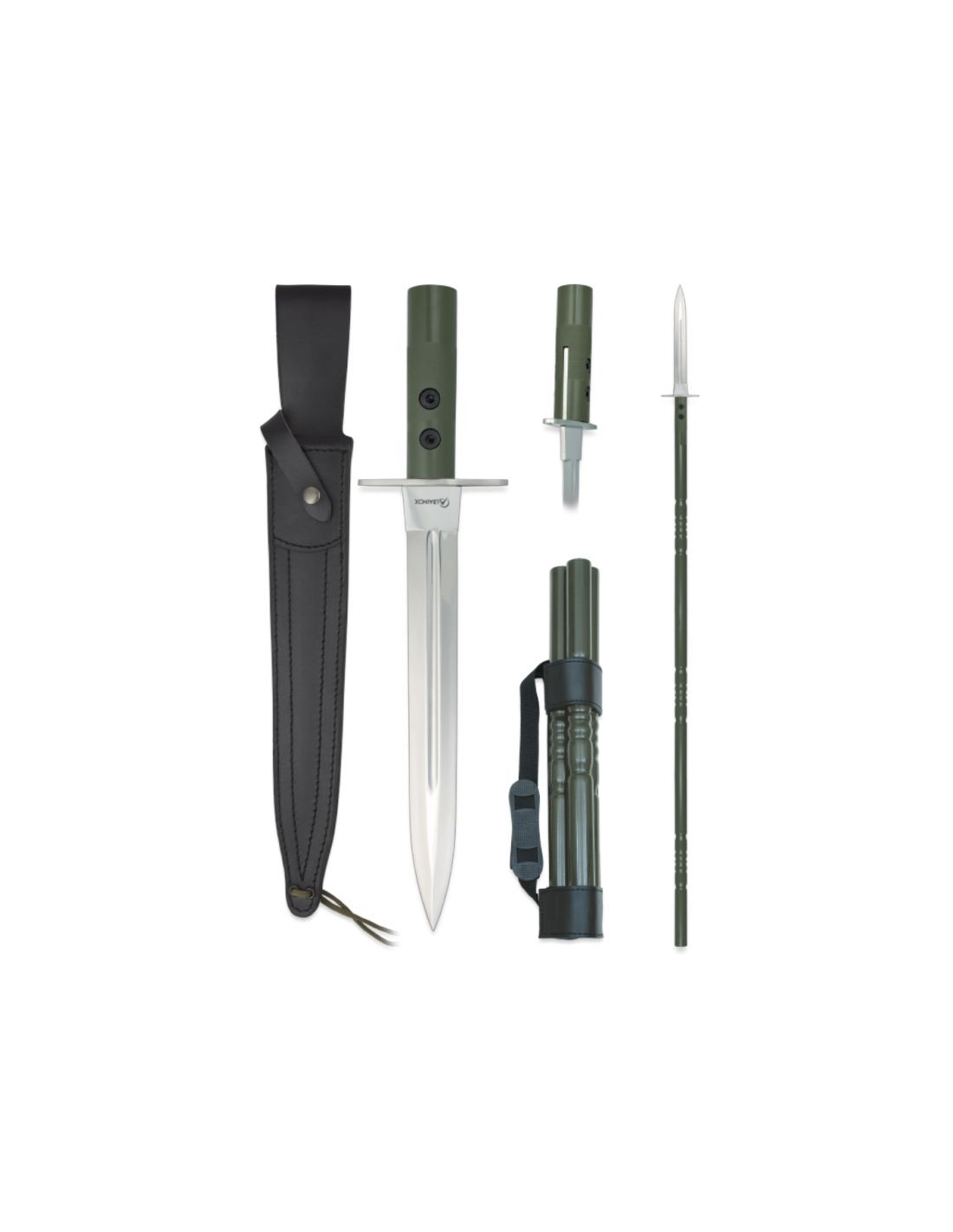 Lanza de caza de remate con hoja de doble filo de acero inoxidable y mango de aluminio color verde. Con acabado brillo y virola de piel. Incluye funda de piel.
