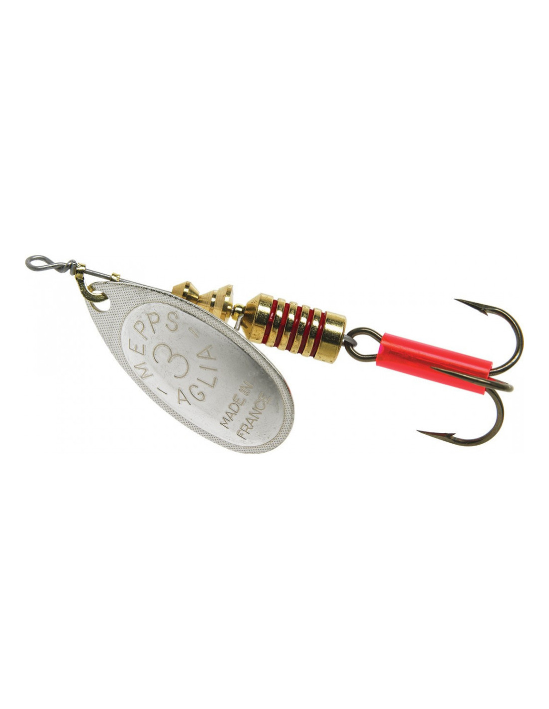 Cucharilla Mepps Aglia disponible en cinco tamaños y con variedad de colores. Anzuelo triple y con muerte.